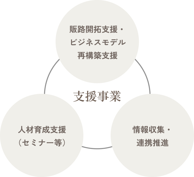私たちについて国内でのものづくりの環境が日々厳しくなる中、自社の成⾧のため、果敢にチャレンジするファッション、ライフスタイル関連のものづくり中小企業の皆さまを、「販路開拓支援・ビジネスモデル再構築支援」「人材育成支援」「情報収集・連携推進」等を通して支援します。