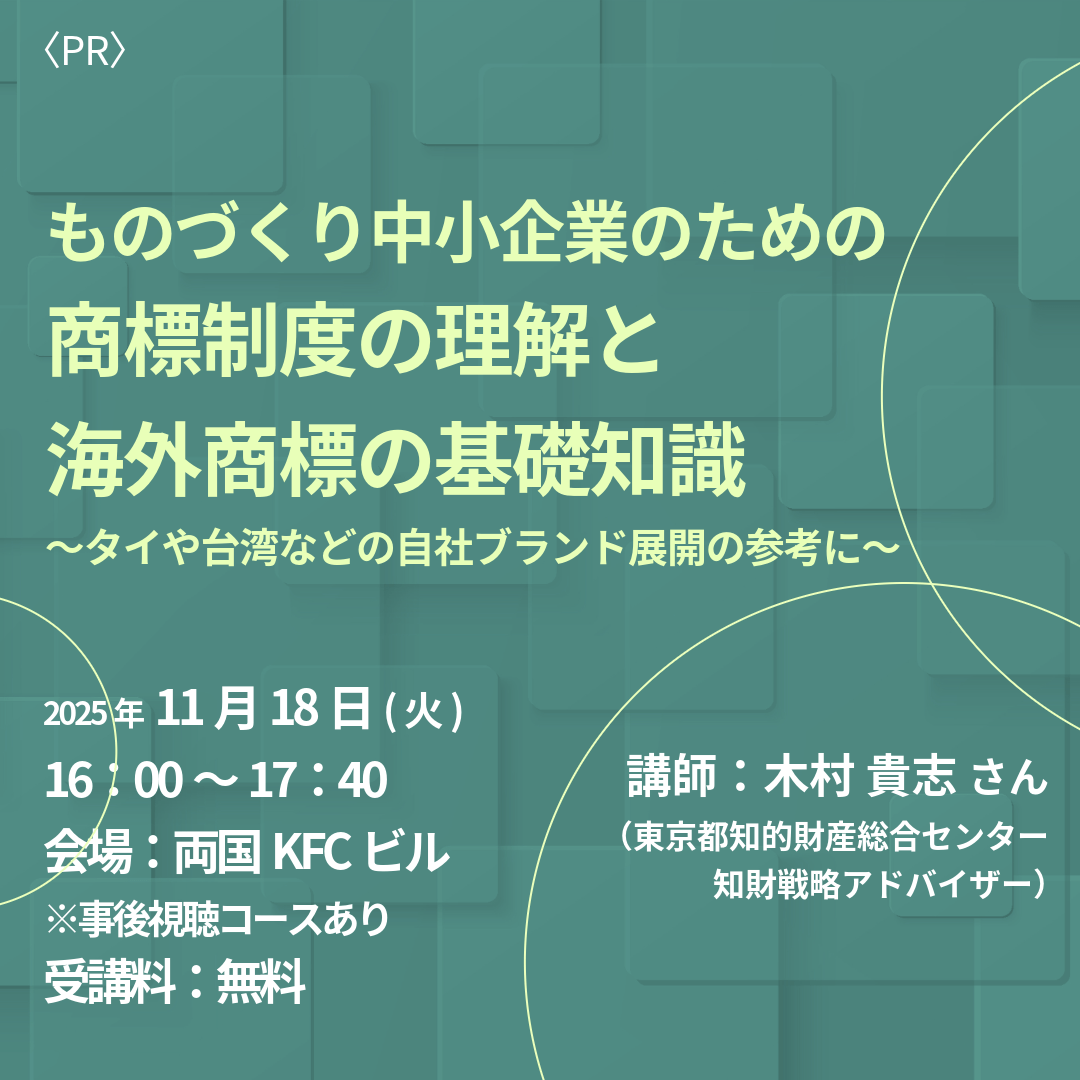 本セミナーでは、企業での知財実務の経験豊富な東京都知的財産総合センター(アドバイザー)木村 貴志 さんを講師に迎え、商標制度(商標法)を概説していただき、商標登録の重要性及び商標登録されるための条件、商標登録の仕方を確認します。商標登録をしなかったが故の事業上の失敗事例や、海外、特にタイ及び台湾を中心に、自社ブランド展開に参考となる商標制度・実務などの基礎知識も紹介します。